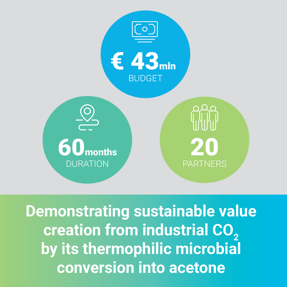 En este contexto, el proyecto PYROCO2 demostrará la escalabilidad y la viabilidad económica de la captura y utilización de carbono (CCU) para producir acetona a partir de CO2 industrial e hidrógeno derivado de electricidad renovable. El núcleo de la tecnología es un bioproceso microbiano termofílico de bajo consumo energético, gracias al cual se proyecta una reducción de 17 Mt CO2eq para 2050.